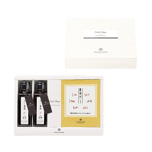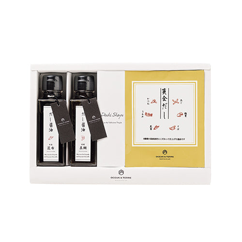 北海道日高昆布醤油100ml×1、愛媛県真鯛醤油100ml×1、黄金だしパック8g×8