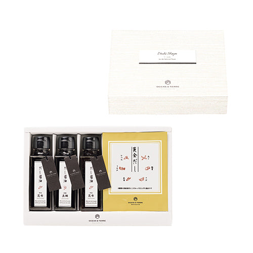 北海道日高昆布醤油100ml×2、愛媛県真鯛醤油100ml×1、黄金だしパック8g×8