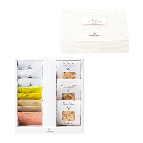 北海道産サケとキャベツクリームパスタソース17.2g×2、北海道産トマトとズワイガニクリームパスタソース16g×1、アビッシーネ・リガーテ70g×1、ロングパスタ タリアテッレ50g×1、フジッリ・ブロンズ70g×1、北海道産かぼちゃスープ16.5g×1、北海道産玉ねぎスープ7g×1、北海道産男爵いもスープ20g×1、北海道産スイートコーンス-プ16.5g×1、北海道産アスパラス-プ16.5g×1