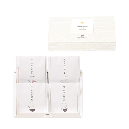 炊き込みご飯の素38g(2合用)×4、ずわい蟹13g×1、帆立2~4個×1、うなぎの蒲焼き13g×1、あさり30g×1、三つ葉0.2g×4、白煎りごま1g×4