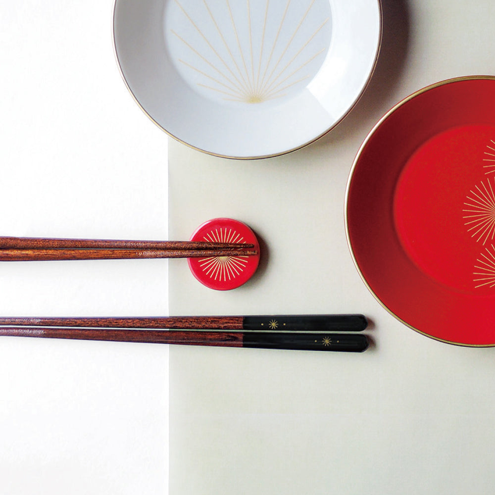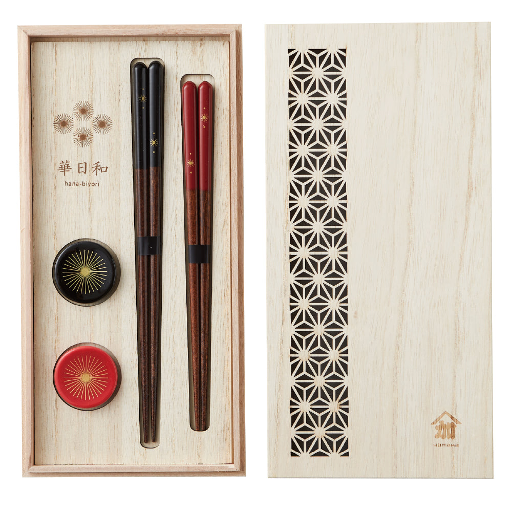 「華日和」シリーズは、日本ならではの和の心を感じられるよう、花火や日の出、和傘をモチーフに高級感のある金色を用い、繊細にあしらいました。日本の夏の風物詩の「花火」の黒と、広げると末広の形になることから日本では縁起が良いとされる「和傘」の赤のデザインを施した夫婦箸と箸置きのセット。飾り木箱に入って高級感のある逸品です。