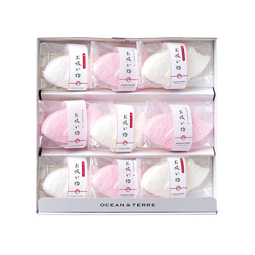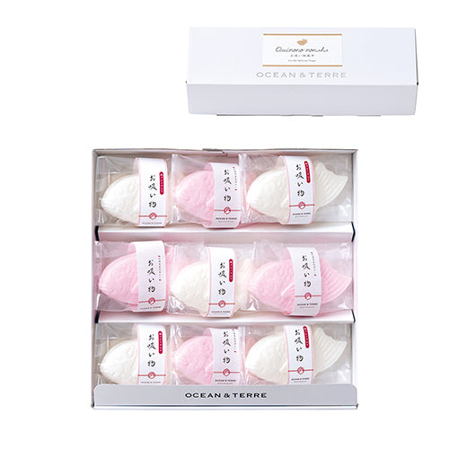 2つの味が楽しめる紅白鯛のお吸い物最中。鯛は長寿の象徴と言われ、縁起が良いとされています。