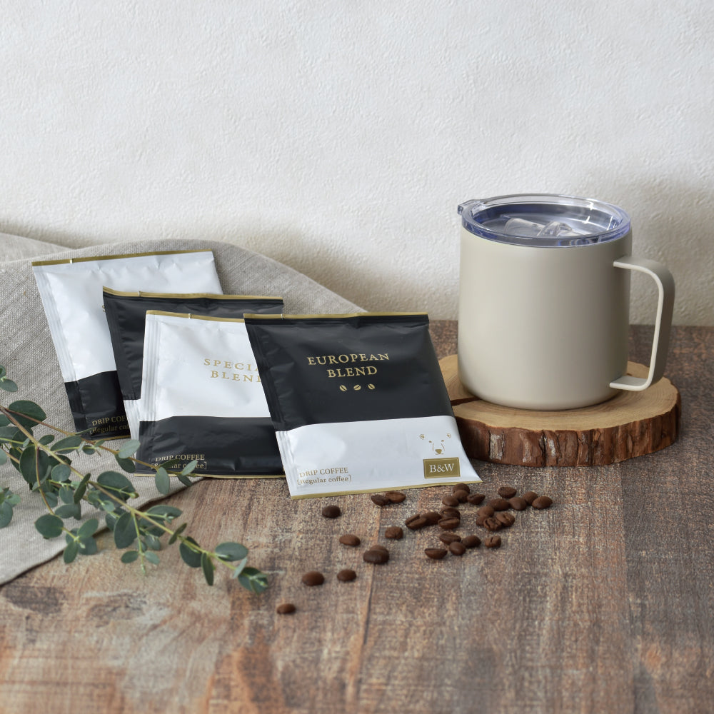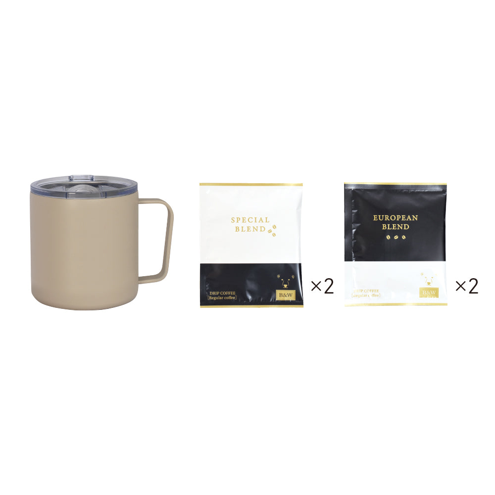◎セット内容・材質/真空二重構造マグカップ(φ8.5×11.7×8.5cm、350ml、ステンレス)×1、蓋(φ8.5×2cm、AS樹脂)×1、ドリップコーヒー(スペシャルブレンド・ヨーロピアンブレンド)×各2
